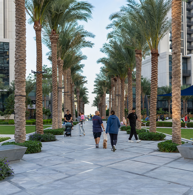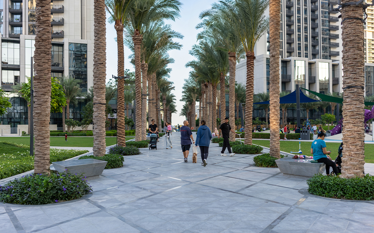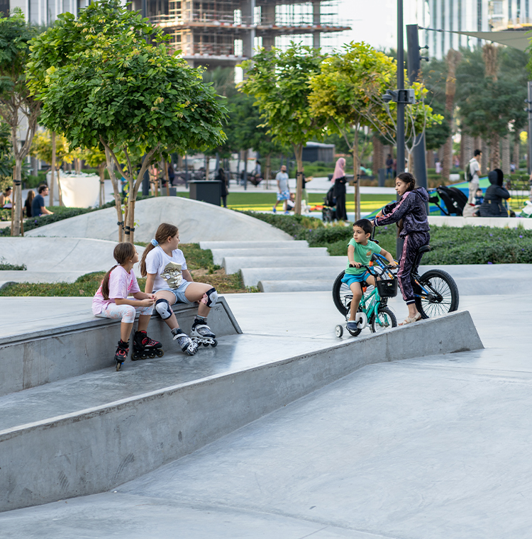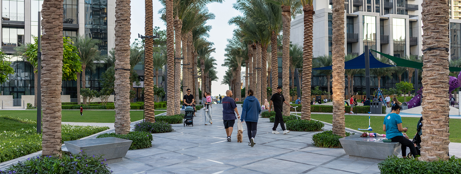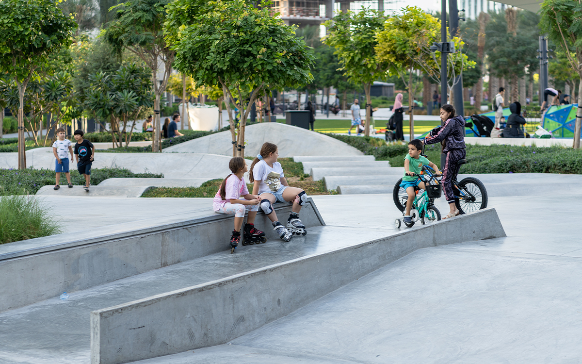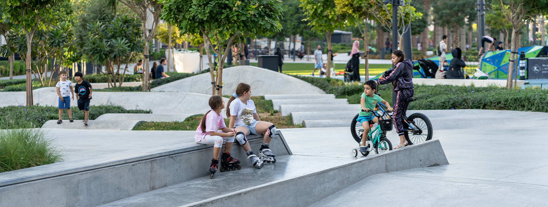 Surrounded by mixed use development including retail and restaurants, the park provides opportunities for play, sports, tree-lined walks as well as respite and privacy for relaxation amongst a back drop of verdant planting and views to the Ras Al Khor Wildlife Sanctuary across the Creek.